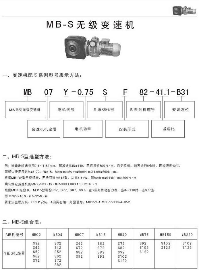 MB-S無級變速機型號表示法選型方法MB-S組合表
